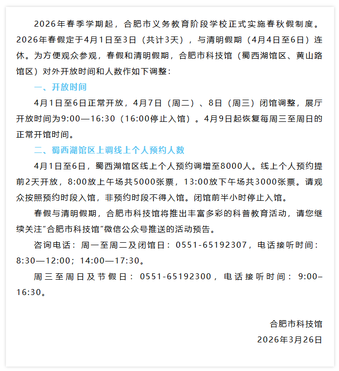 合肥市科技馆春假及清明假期开放公告